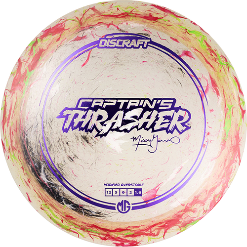 Discraft and team co-captain Missy Gannon designed the Captain's Thrasher to be a more stable version of her most trusted driver. It has an added punch of torque resistance to hold up to the demands of the pro tour. This run retains the same stability of the first run of Captain's Thrashers and is made of a grippy Jawbreaker Z blend. This mix of Jawbreaker Z isn't as soft as the Jawbreaker FLX 2024 Tour Series run, but has the same awesome swirl patterns that makes each disc unique.