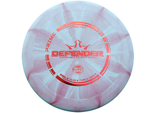 The Defender is an overstable distance driver made by Dynamic Discs. It is great for max distance shots and and headwind drives. Lower arm speeds will see a reliable fade in all conditions. This is a great disc for all players whether it becomes your max distance driver or your overstable utility disc. Prime plastic has an incredible feel and excellent grip even when the weather compromises your hold on your favorite disc. Prime offers an affordable line of plastic for players looking to add a new disc to the bag. Prime Burst is a very unique looking plastic that has a mixture of 2 or more colors bursting from the center outward. All colors offered are the primary base color only and each one is entirely unique!