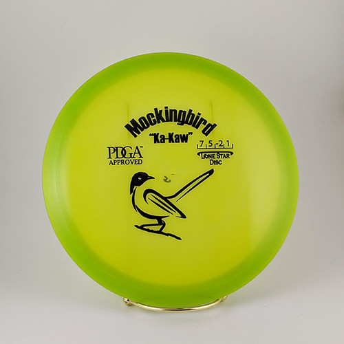 The Mockingbird is Lone Star's do-it-all fairway driver. You can release it flat for straight lines, put it on a hyzer for some slight fade or finesse it for a controlled anhyzer. The Mockingbird has a domey top which gives it an extra touch of glide. Beginners will love its neutral flight and more experienced players can trust this disc for accurate tunnel shots through narrow fairways. Lone Star Glow is a glow material that feels and flies similar to LSD's Bravo plastic.
